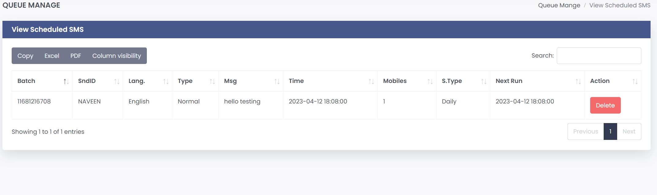 User can see all his scheduled sms , he can check and even delete them.